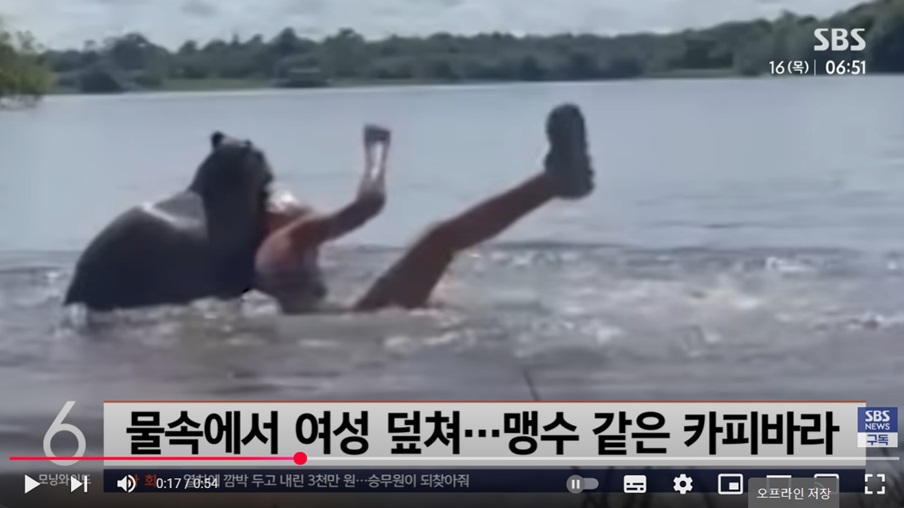 일반적으로 온순하다고 알려진 야생 카피바라가 갑자기 사람을 덮쳐 물속으로 끌고 가려 했습니다.