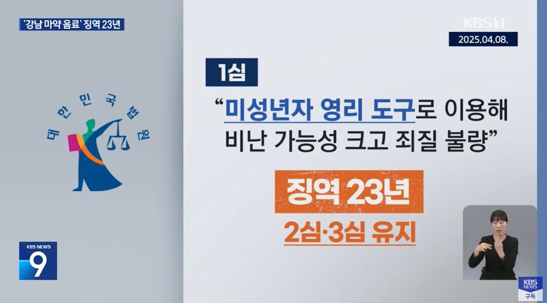 서울 강남의 학원가에서 어린 학생들에게 마약이 혼합된 음료를 제공한 주범이 징역 23년형을 선고받았다.