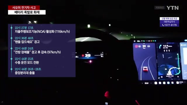사고 차량은 충돌 17분 전 자율주행보조 기능을 켠 상태에서 시속 116km로 달리고 있었다.